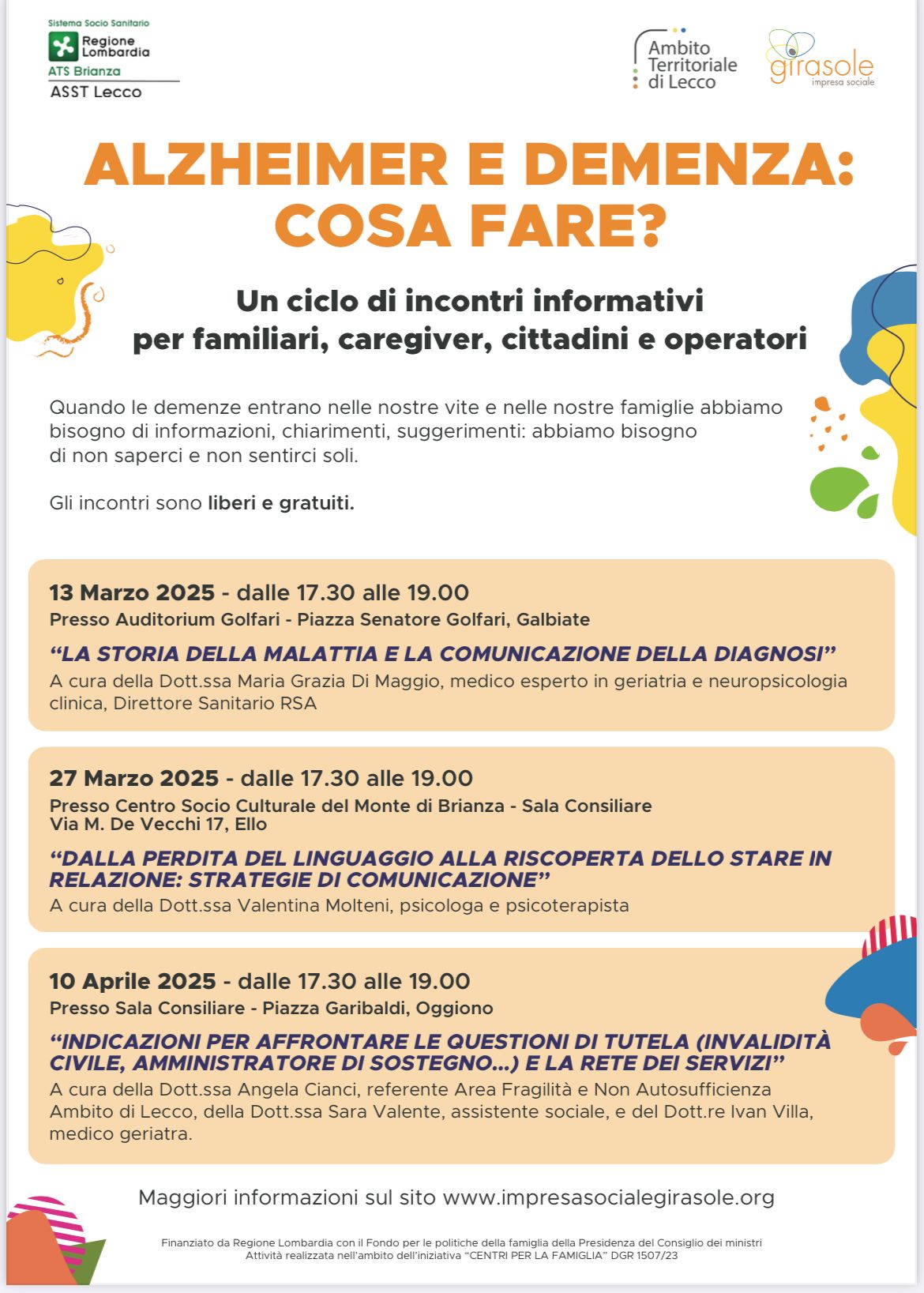 ASST di Lecco, Ambito territoriale di Lecco e Impresa Sociale Girasole organizzano un ciclo di incontri informativi liberi e gratuiti dal titolo "Alzheimer e demenza: cosa fare?", destinato a familiari, caregiver, cittadini e operatori.