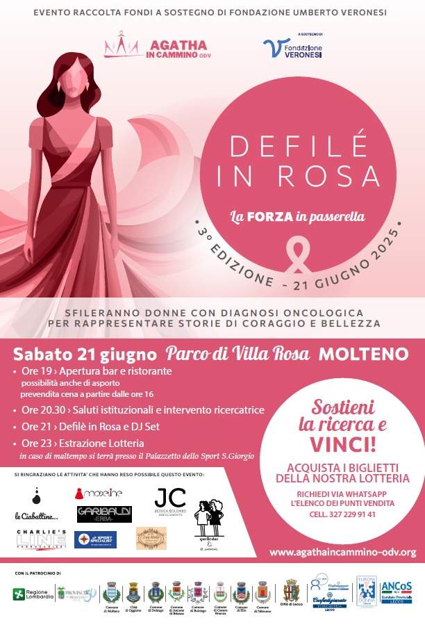 L’Associazione Agatha in cammino ODV organizza la terza edizione del “Defilé in rosa. La forza in passerella”, sabato 21 giugno 2025, presso il Parco di Villa Rosa a Molteno. Donne con diagnosi oncologica sfilano per raccontare storie di coraggio e bellezza.