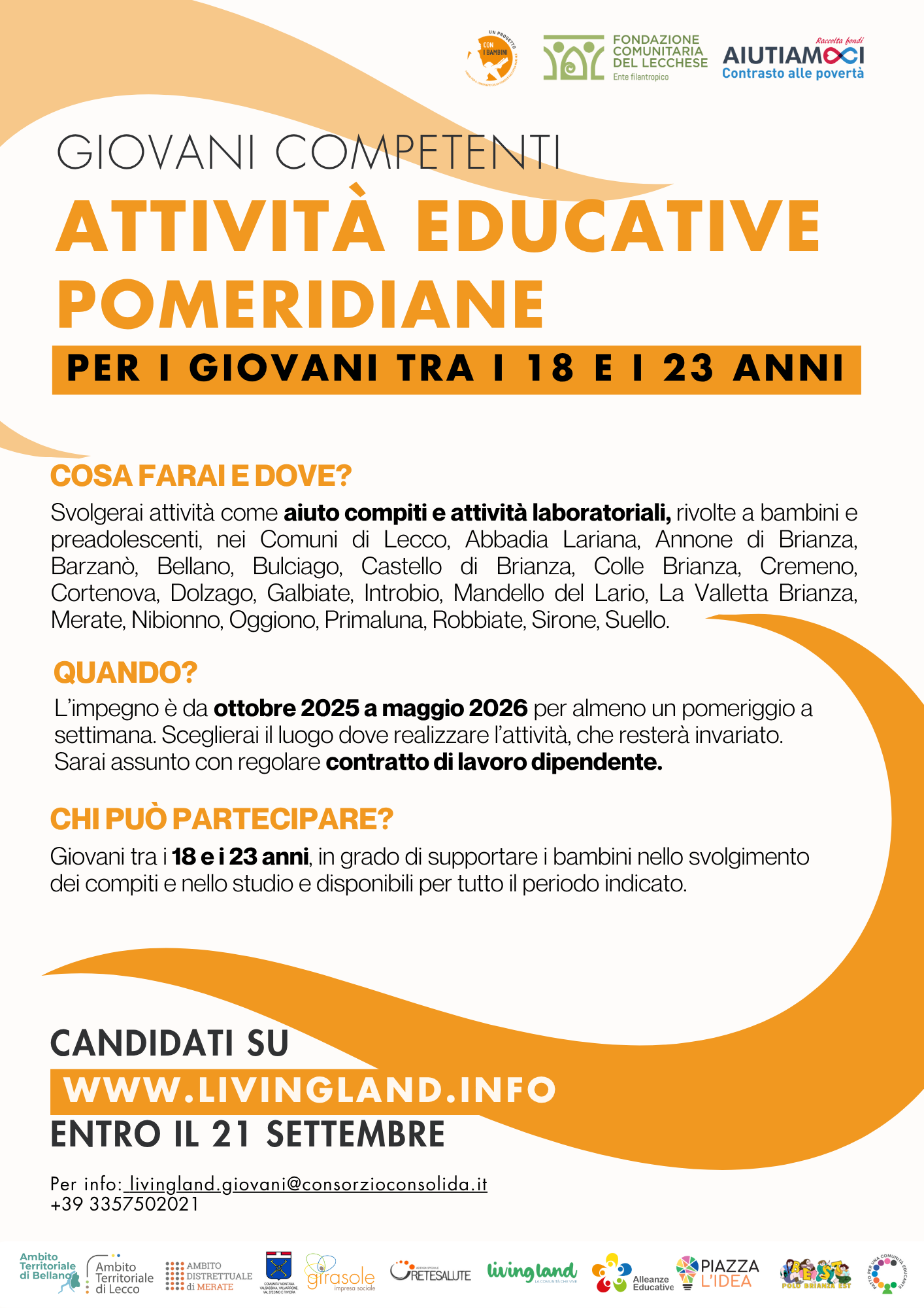Ai giovani verrà richiesto di aiutare i bambini nello svolgimento dei compiti e nelle attività laboratoriali, in affiancamento ad un educatore. È richiesto un impegno da ottobre 2025 a maggio 2026 per almeno un pomeriggio a settimana. Il giovane verrà assunto tramite regolare contratto di lavoro dipendente. Per partecipare al bando sono richiesti i seguenti requisiti: