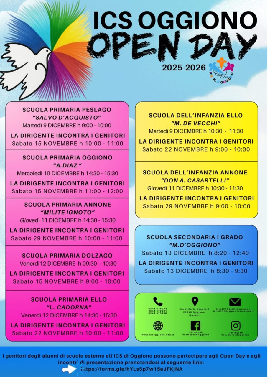 I genitori interessati all'iscrizione dei propri figli ad uno dei plessi appartenenti l'Istituto Comprensivo Scolastico Oggiono per l'anno 2025-2026 possono partecipare alle giornate di Open Day programmate.