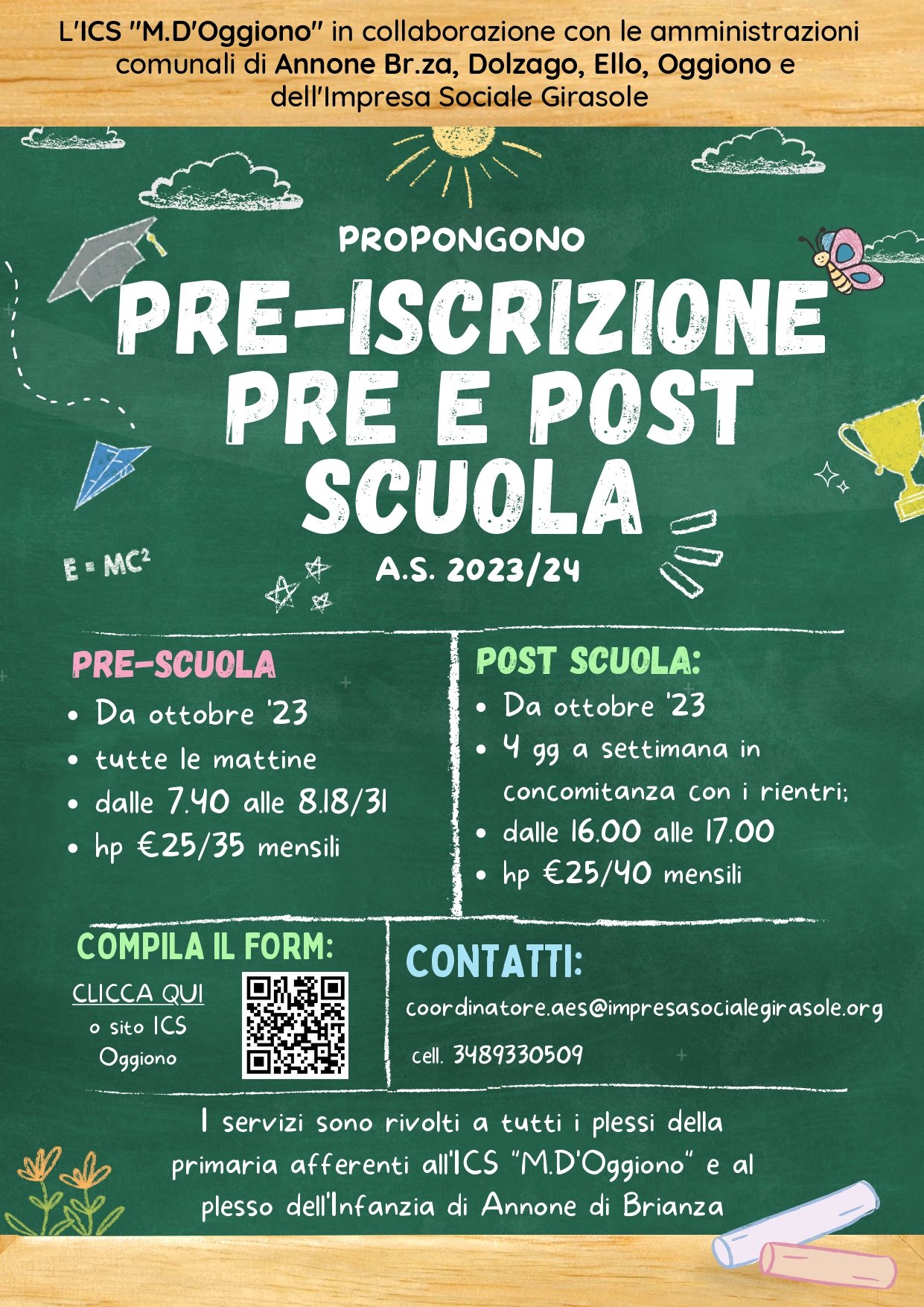 L' ICS "M. D'Oggiono" in collaborazione con le amministrazioni comunali di Annone Brianza, Dolzago, Ello, Oggiono e l' Impresa Sociale Girasole, propongono la pre-iscrizione al Pre e Post Scuola per l'anno scolastico 2023/2024. I servizi sono rivolti a tutti i plessi della primaria afferenti all' ICS "M. D'Oggiono" e al plesso dell'Infanzia di Annone di Brianza. Per i dettagli dei servizi proposti, i costi, e per compilare il form della pre-iscrizione, scarica il volantino allegato alla presente news.
