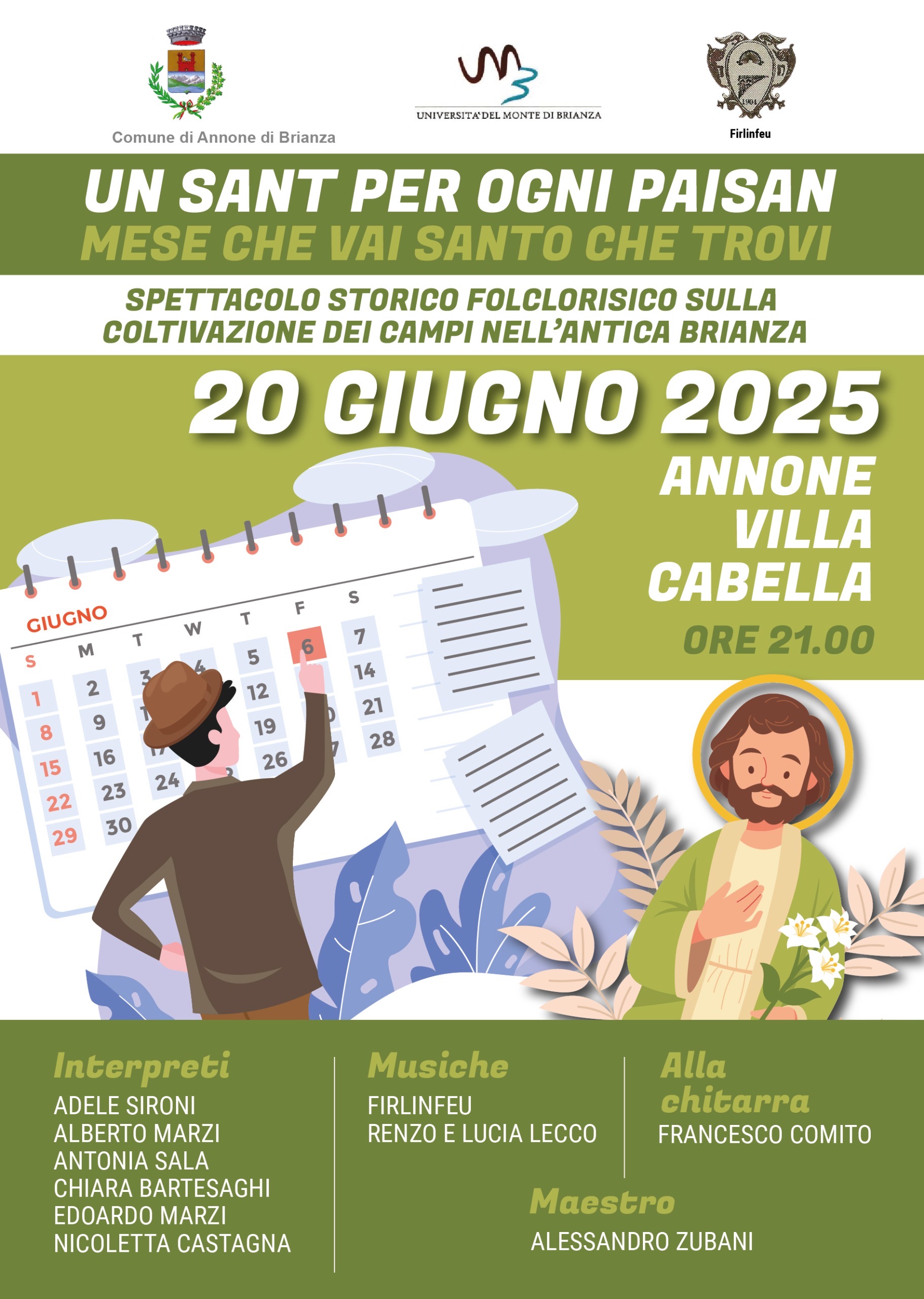 Spettacolo storico folcloristico sulla coltivazione dei campi nell'antica Brianza. Si terrà presso Villa Cabella il 20 giugno 2025 alle ore 21:00.