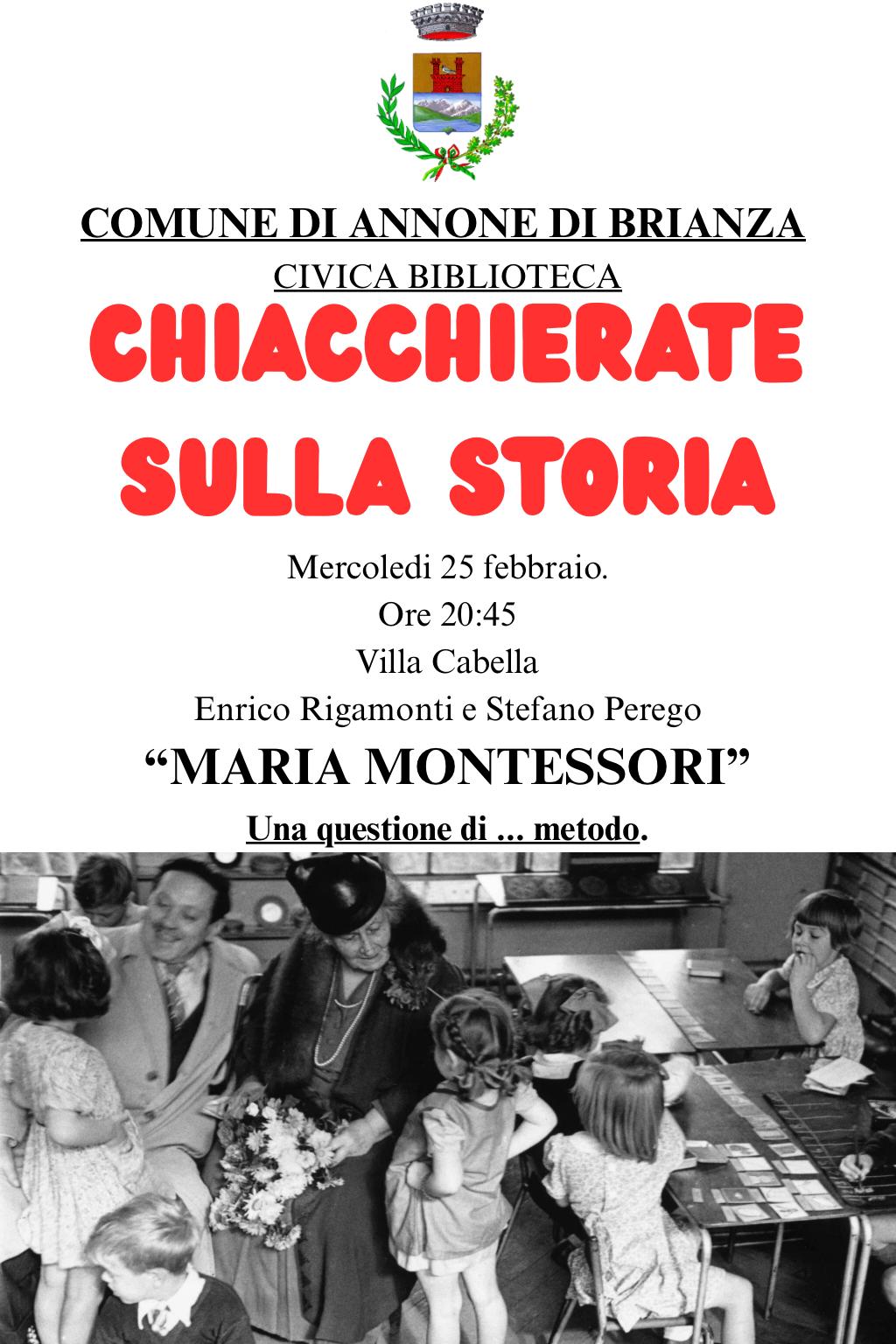 Il Comune di Annone di Brianza, in collaborazione con la Biblioteca Civica, Enrico Rigamonti e Stefano Perego, organizza l'incontro "Chiacchierate sulla storia - Maria Montessori: una questione di...metodo''.