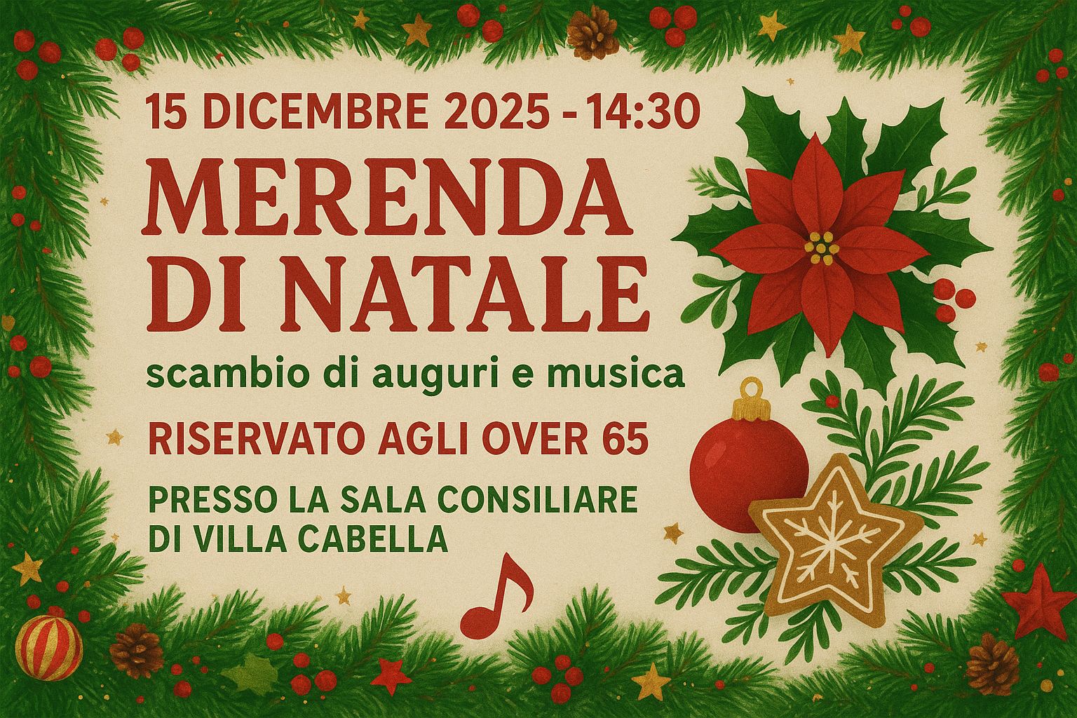 Cos'è L'Amministrazione Comunale propone una merenda di Natale e scambio di auguri con musica riservata agli over 65, fissata per lunedì 15 dicembre alle ore 14:30 presso la Sala Consiliare di Villa Cabella.