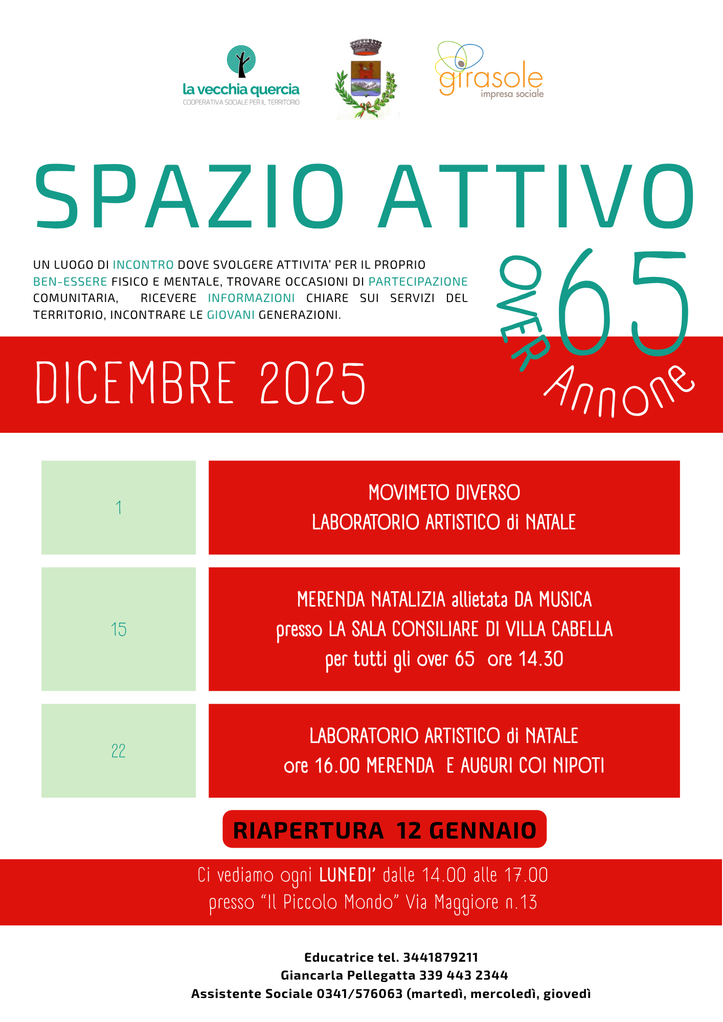 Il progetto Spazio Attivo prevede l'apertura dedicata agli over 65 de "Il Piccolo Mondo", dove si potrà svolgere attività per il proprio benessere fisco e mentale, trovare occasioni di partecipazione comunitaria, ricevere informazioni chiare su servizi del territorio, incontrare giovani generazioni.
