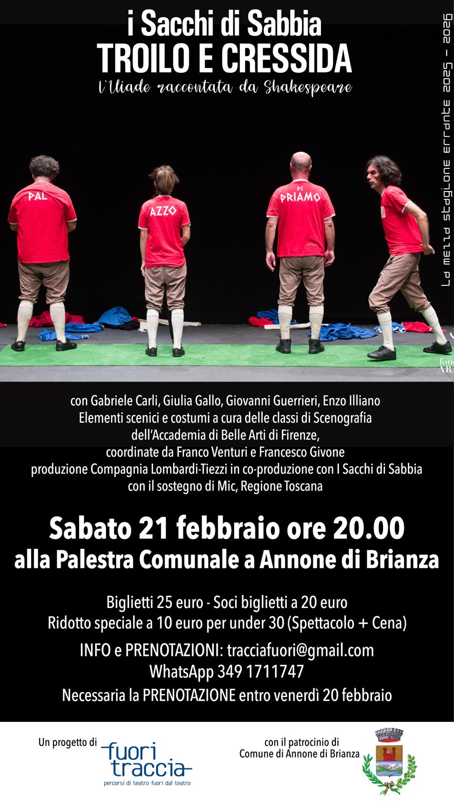 Sabato 21 febbraio alle ore 20:00 presso la Palestra Comunale di Annone di Brianza, si terrà lo spettacolo "Troilo e Cressida" ideato dalla Compagnia Lombardi-Tiezzi in co-produzione con I Sacchi di Sabbia, con il sostegno di Mic e Regione Toscana.
