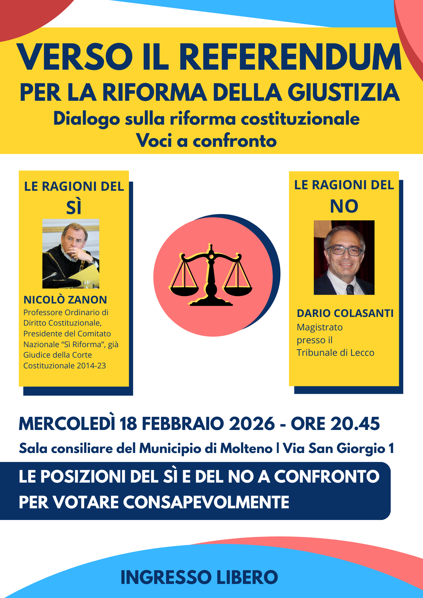 L'incontro prevede la presenza del Dott. Nicolò Zanon e del Dott. Dario Colasanti, due esperti di diritto, che potranno offrire una lettura interessante e contrapposta della riforma costituzionale.